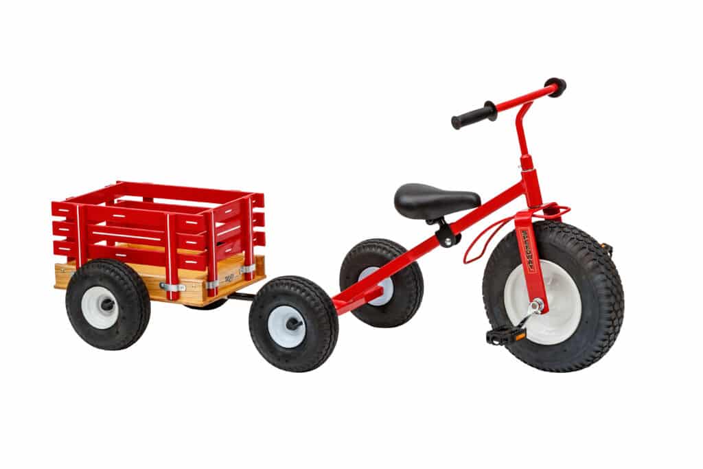 It is tough to find any tricycles like this out there. Most have elements of plastic, no rubber wheels, and are not as durable. This tricycle also offers an add-on! You have the option to purchase a tricycle wagon to hitch to the back of the tricycle!