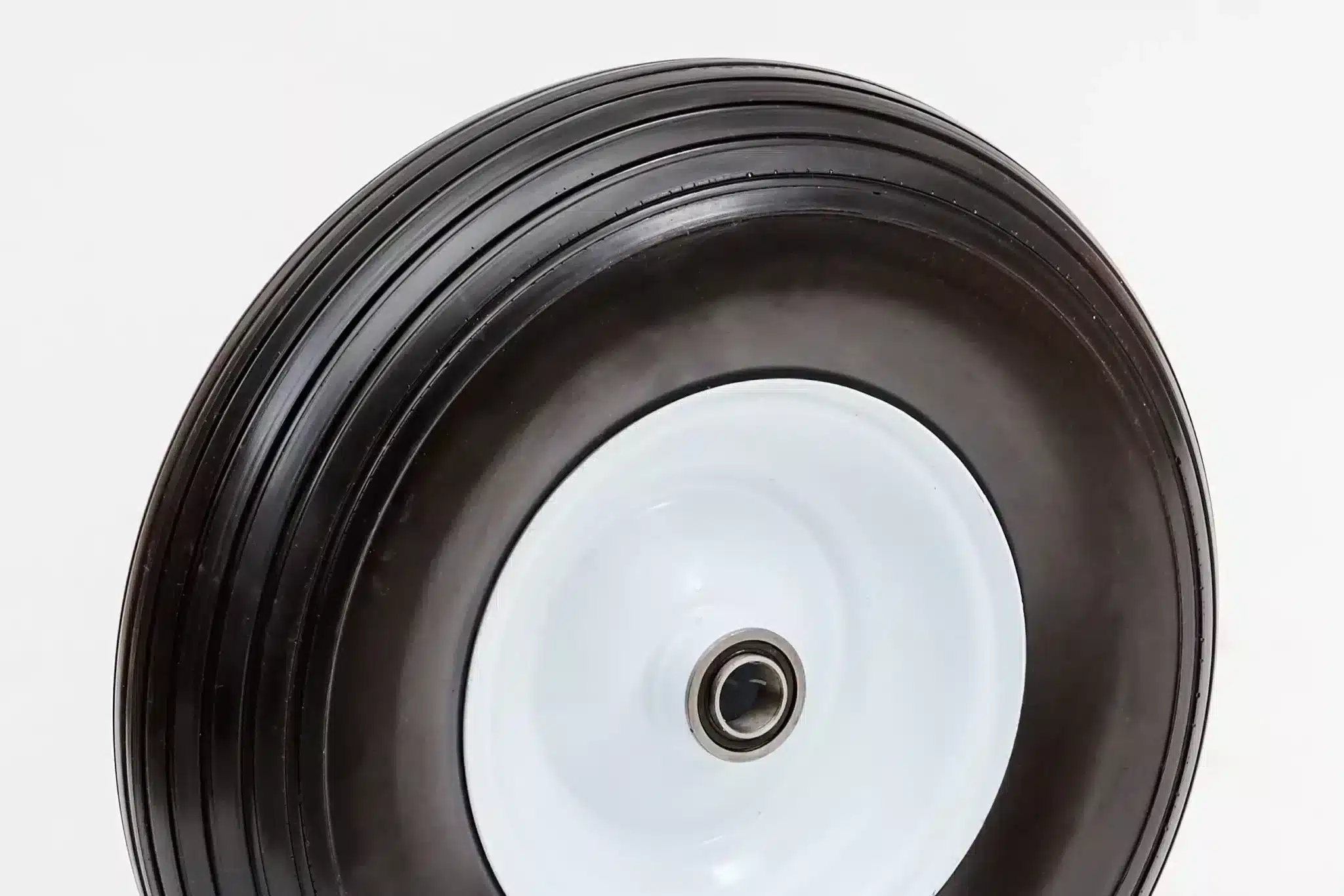Flat Free wheels are wheels that are filled with polyurethane or a foam substance. Polyurethane usually comes in the form of flexible foam and is almost like a cushioning material. Flat-free tires are best for wagons, air compressors, and more.