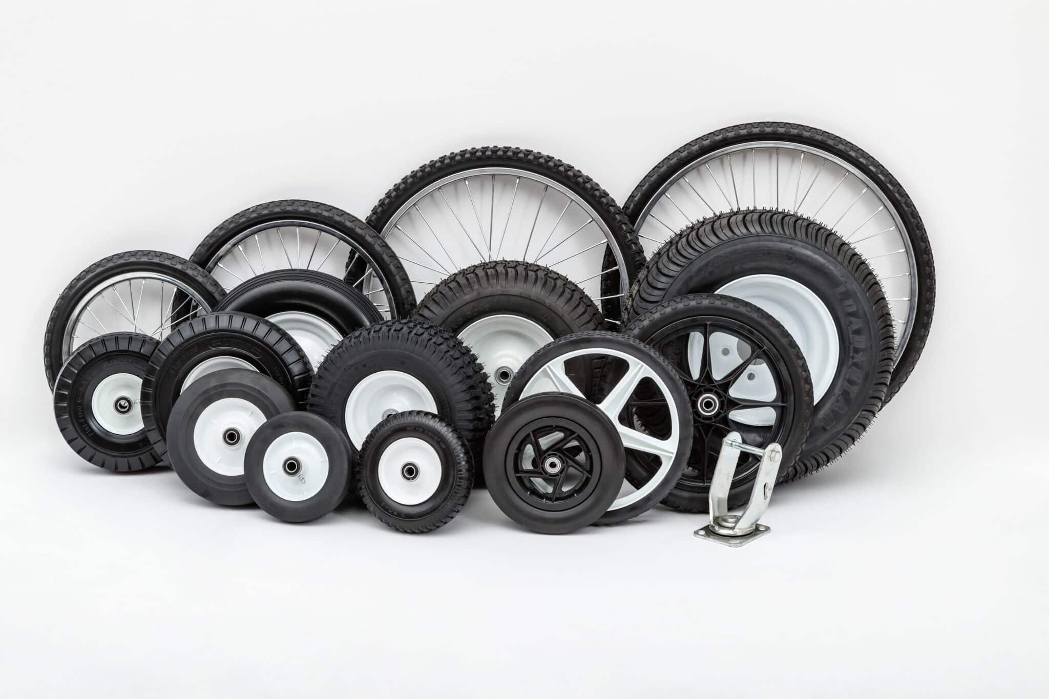 - Pneumatic Wheels – These wheels are filled with air and should be maintained to their individual PSI levels. Pneumatic wheel sizes are generally found for wheelbarrows, garden carts, and utility carts.
