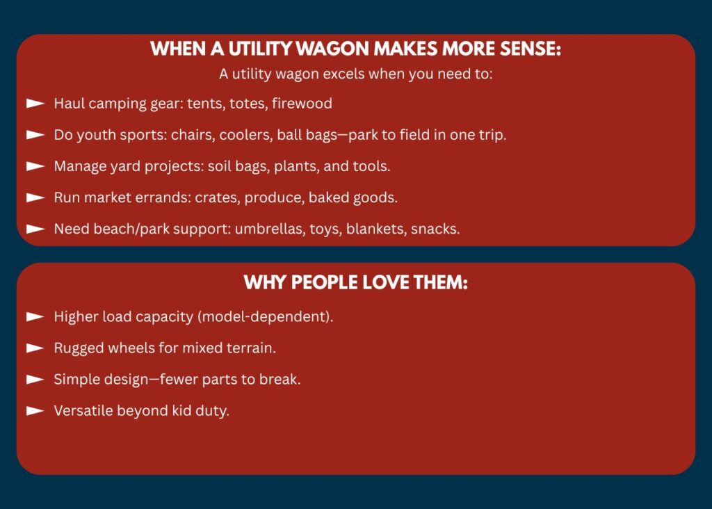 - Choose a utility wagon if you’re hauling gear for camping, sports, yard work, or markets—and you want durable wheels and real capacity.