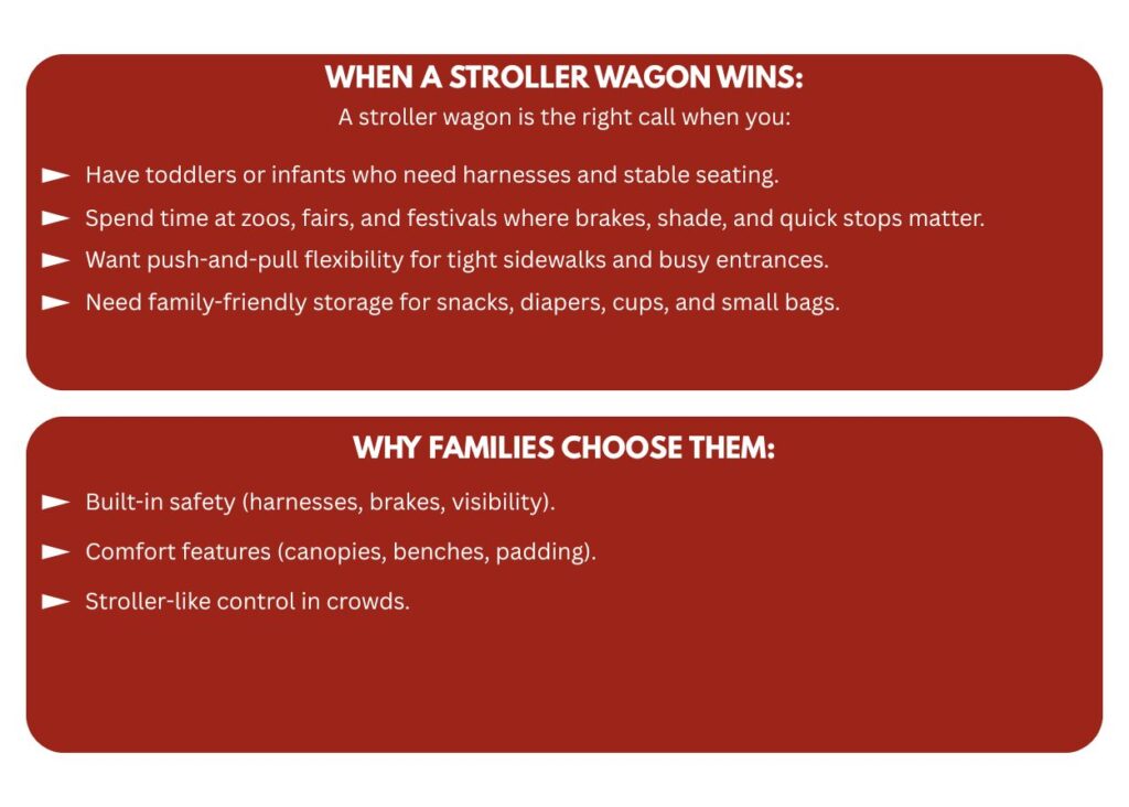 If your typical day includes naps, snacks, and stroller parking, the stroller wagon’s convenience and safety-forward design is tough to beat.