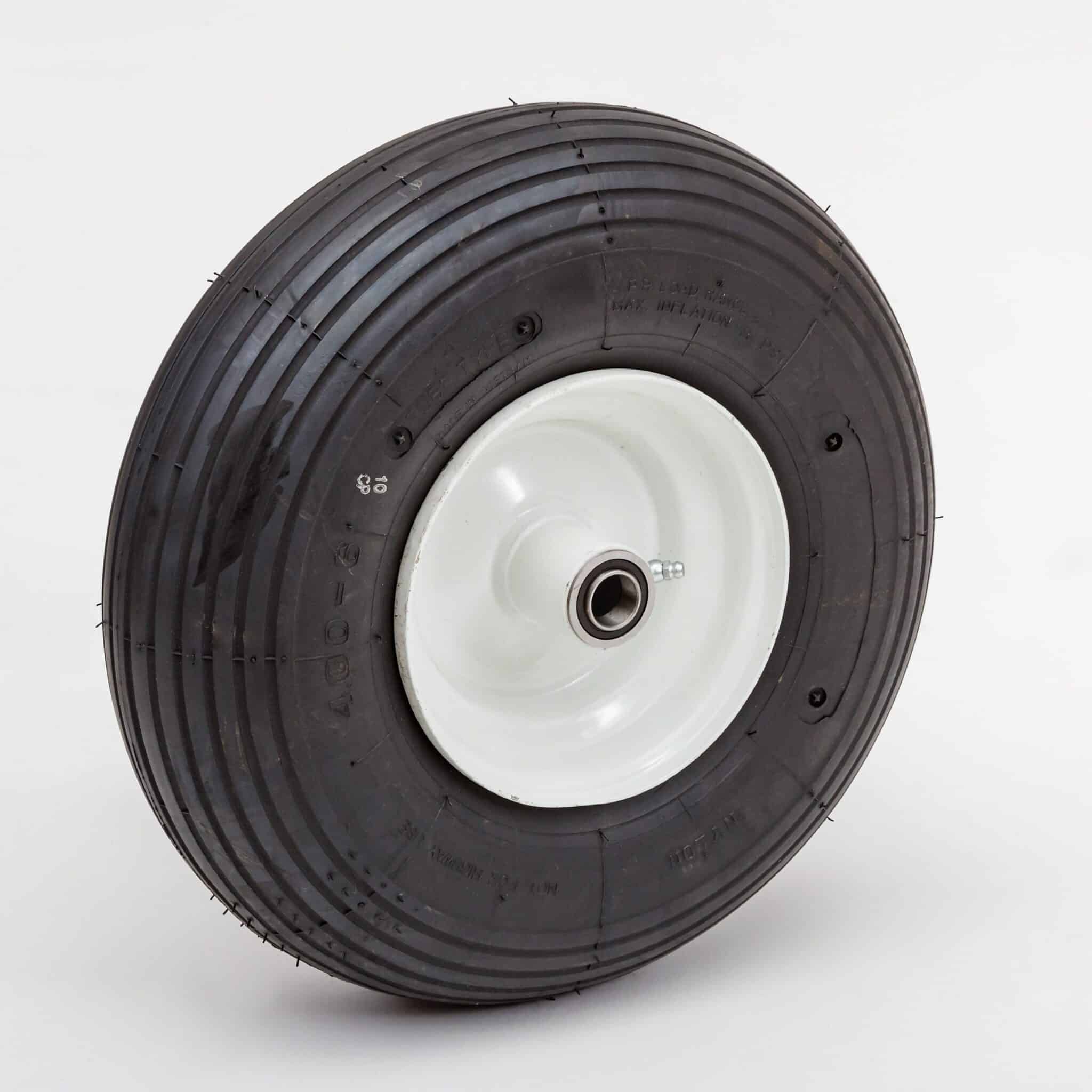Need a high quality, cost-effective pneumatic replacement wheel for your wood chipper, wagon, garden cart, or wheelbarrow? Well, then this 13.6″ pneumatic wheel is the perfect choice for you! This wheel features a 4.00-6 wheel size and ribbed 4 ply tread pattern, giving you the best on-road traction in both wet and dry conditions. Options are also available so that you can find the exact replacement fit you are looking for. Choose either a 3″ centered, 3.25″ off-centered, or 4″ off-centered hub, as well as a 5/8″ or 3/4″ bearing. White or yellow rim colors are also available, depending on the pneumatic replacement wheel you choose. This wheel also features a 450lb weight capacity, giving you the durability and strength you need for your most heavy-duty tasks. Consider this 13.6″ pneumatic wheel for your ATV trailer replacement wheel, wheelbarrow, garden cart, nursery carts, wheel replacement need today.
