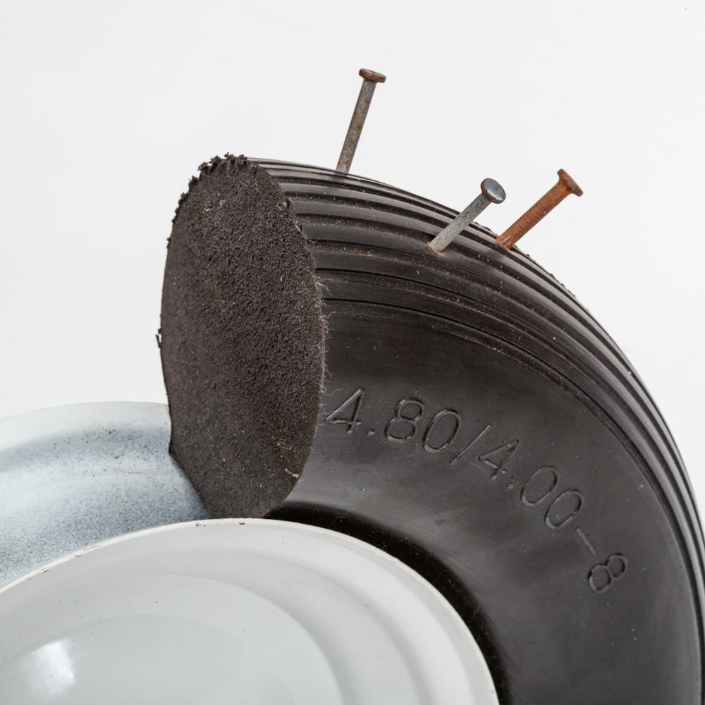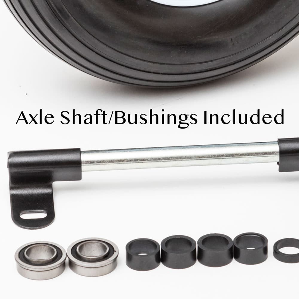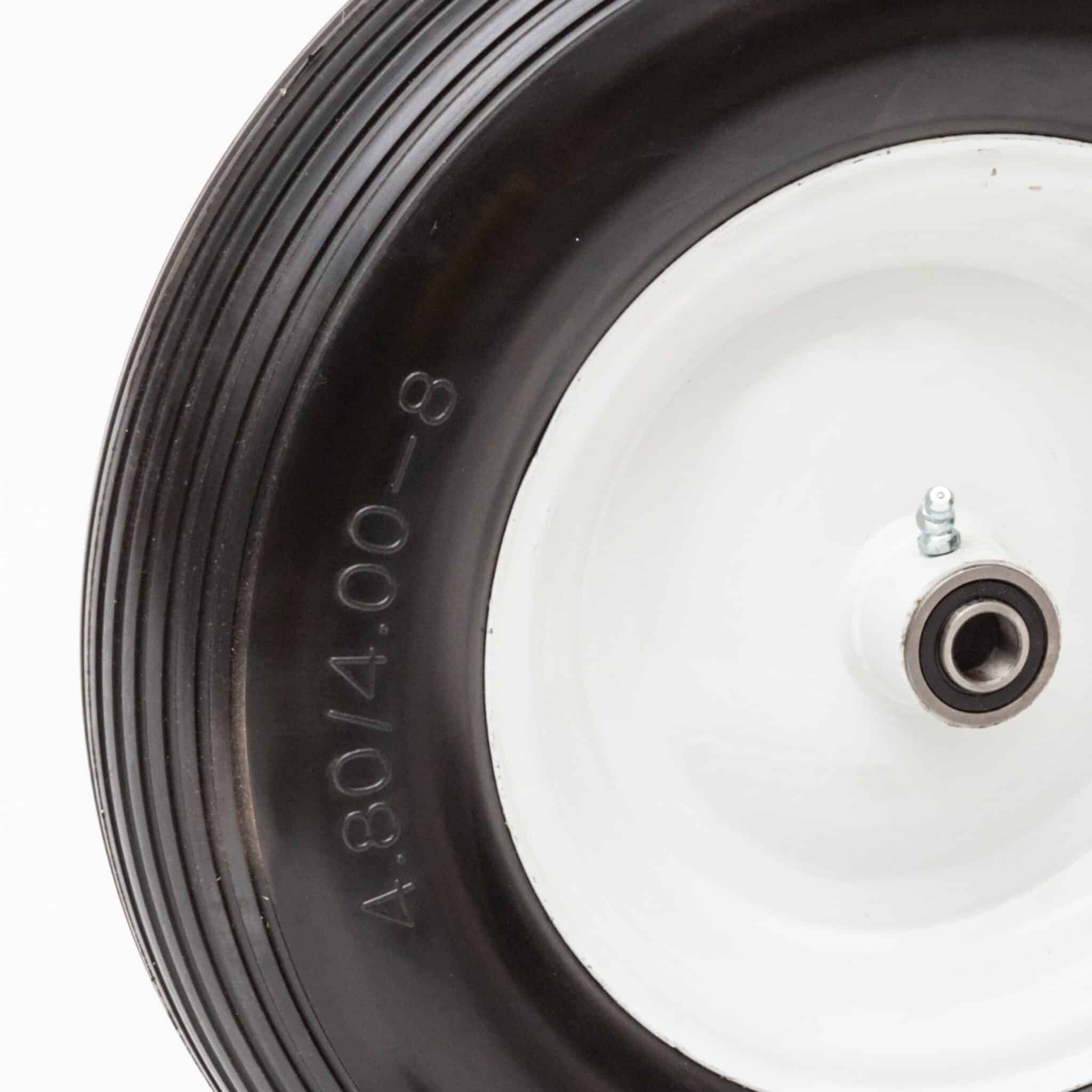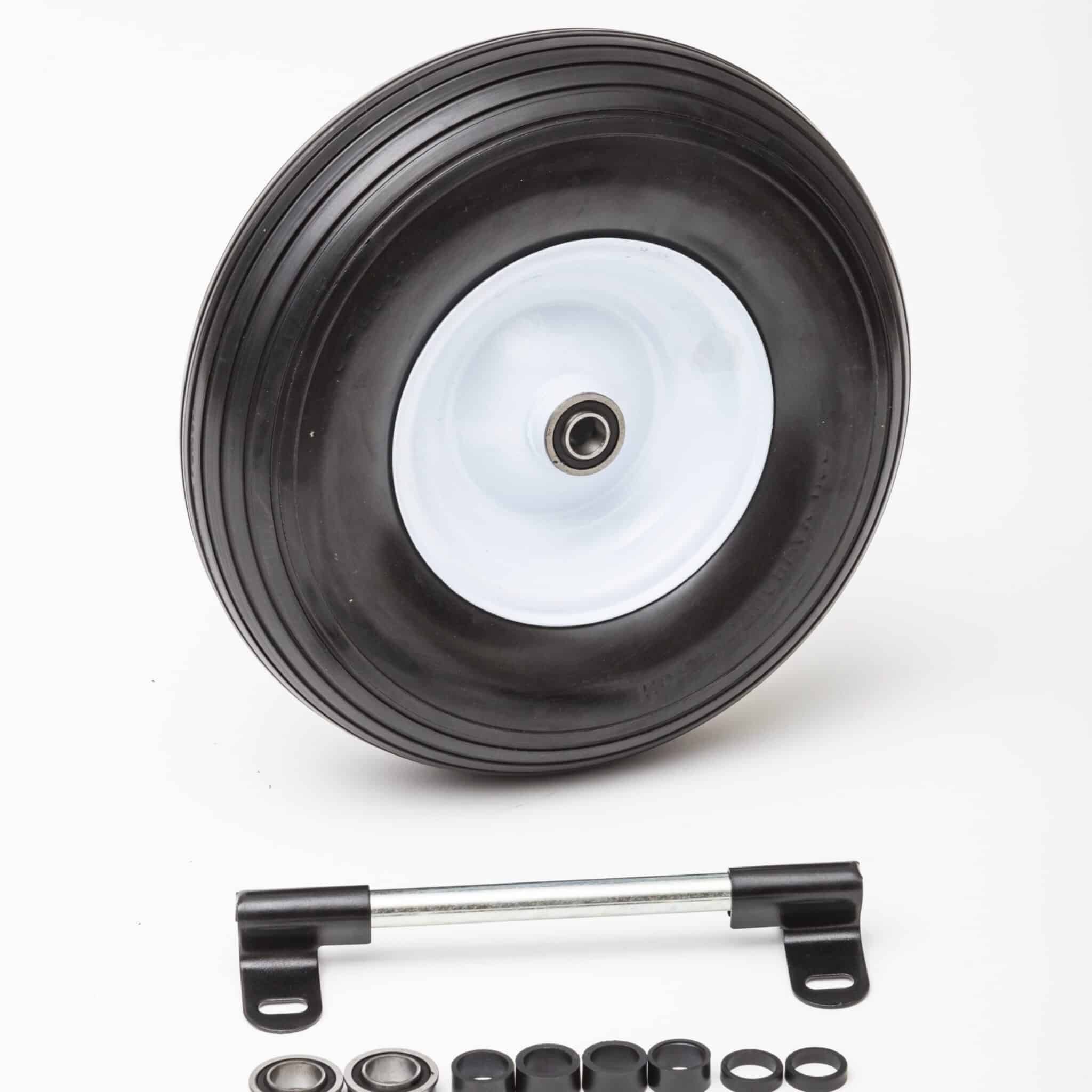 Are you frustrated with always getting flat tires on your wheelbarrow? Replace it with a Flat Free Universal Wheelbarrow Wheel featuring a white rim and ribbed tread that should fit almost any wheelbarrow. Choose your wheelbarrow wheel size. The package includes a wheelbarrow axle shaft and bushings to fit almost any wheelbarrow.