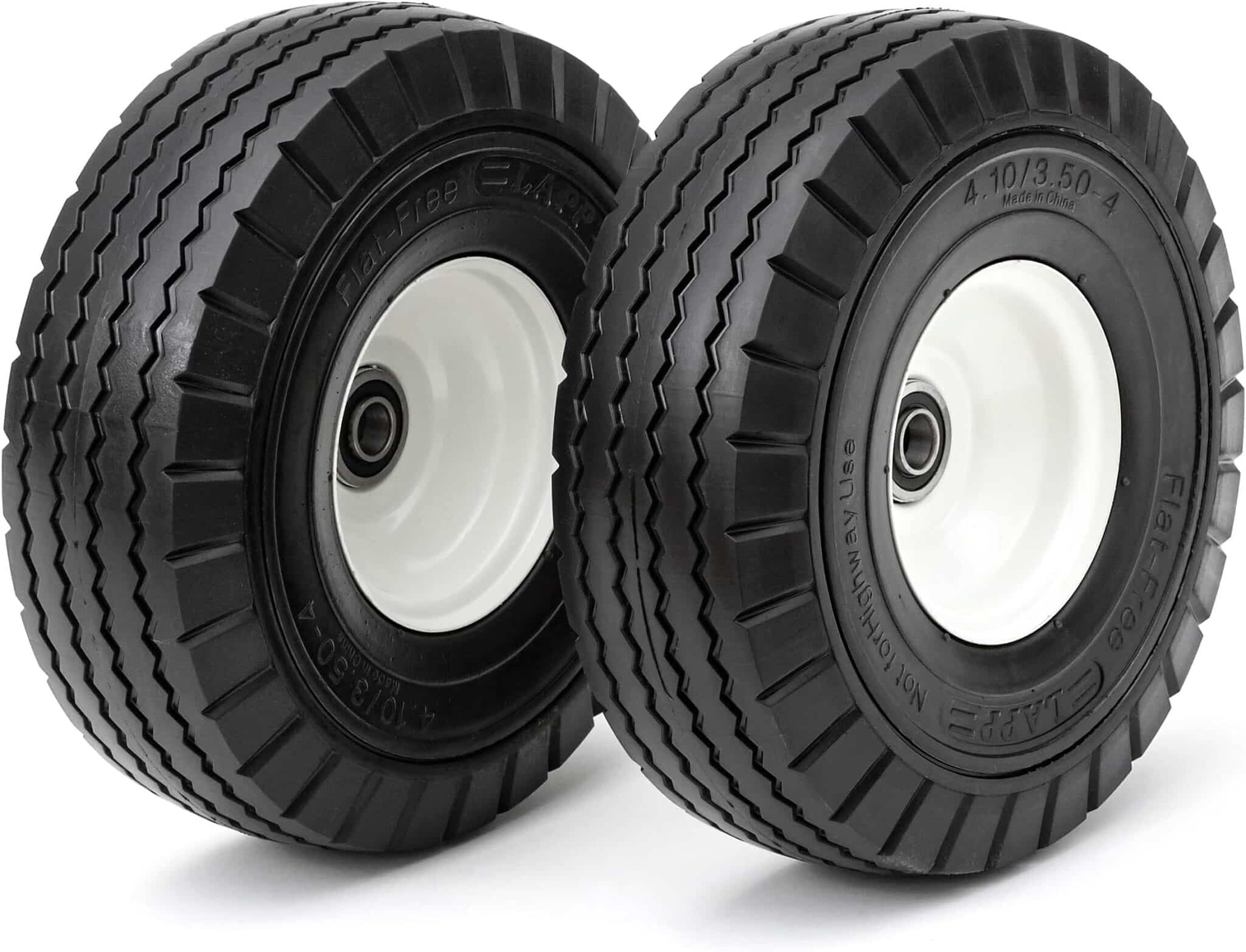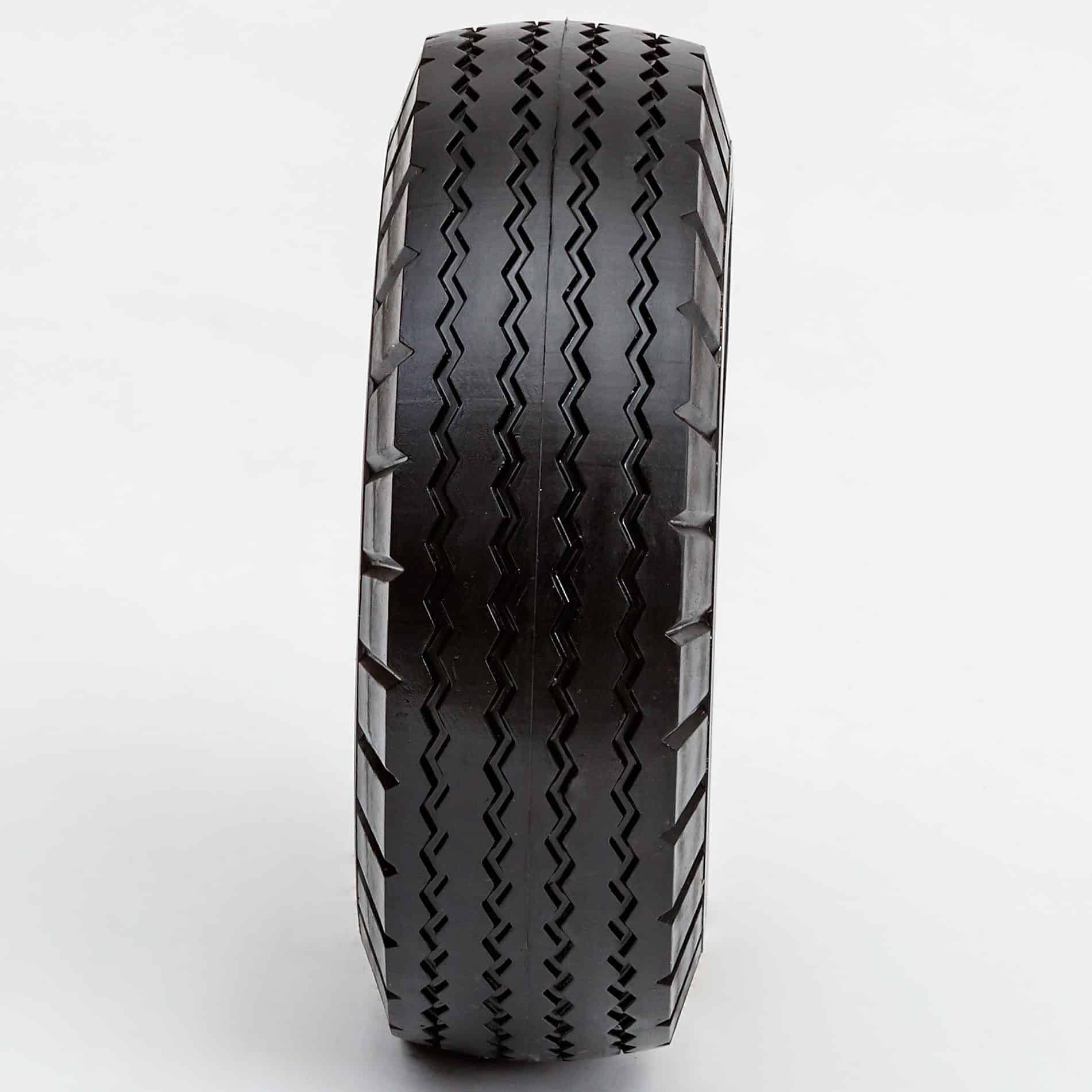 We know how troublesome flat tires on your wagons, nursery carts, hand trucks, and utility equipment can be for your progress on whatever task is at hand. That’s why we offer our 10.5″ flat-free cart tires, allowing you to keep working on the task at hand and not need to waste any time worrying about your tires going flat! These cost-effective, high-quality flat-free wheels come standard in a 4.10/3.50-4 wheel size with a sawtooth tread pattern, giving you excellent two-way traction and mobility, making your life just that much easier. Our options for these wheels include choices of a 2.25″ off-centered or 3″ off-centered hub, as well as a 1/2″, 5/8″, or 3/4″ bearing. If weight capacity is a concern, rest easily knowing that these flat-free cart wheels can withstand up to 300lbs depending on the wheel you select. At the end of the day, these flat-free wheels will be an excellent, long term solution to keep your equipment moving in the right direction. The match perfectly with popular hand truck brands like Pemberly, Milwaukee, Harper, Envision, magliner, Strongway, and many more.