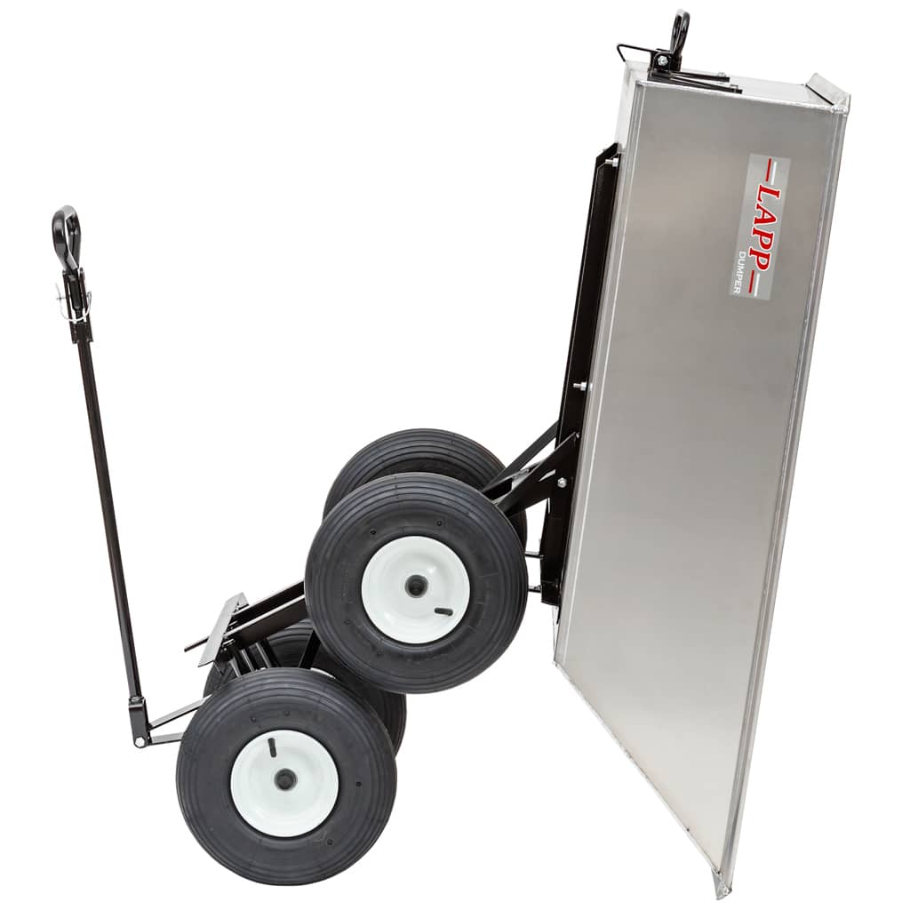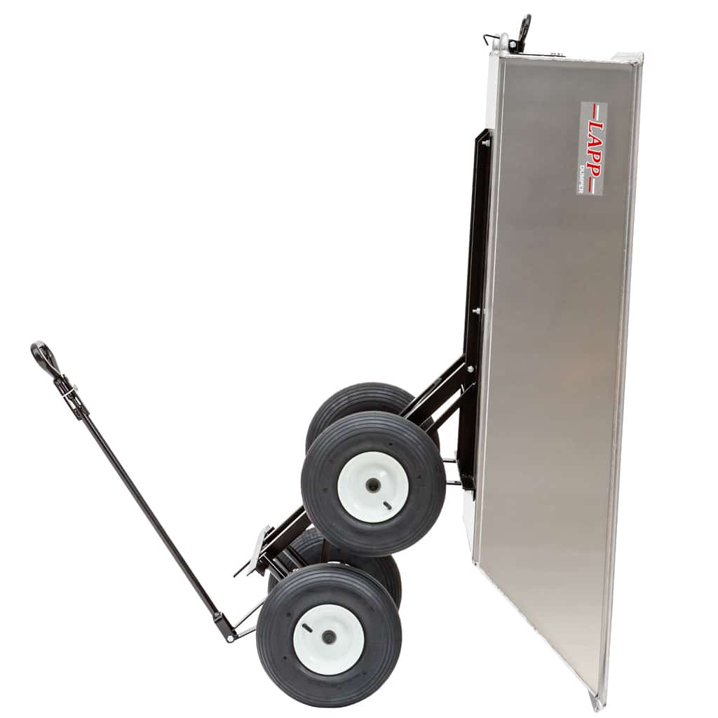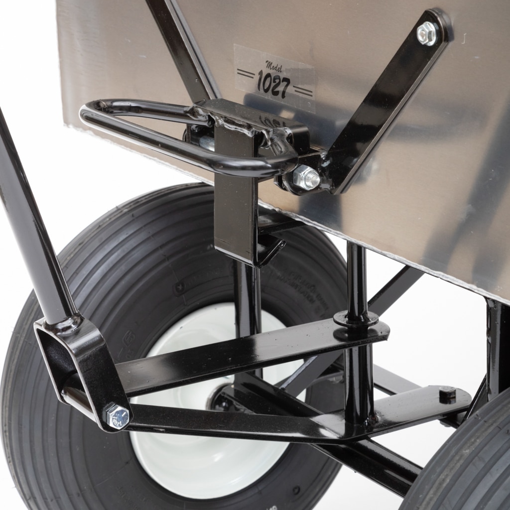 Every wagon underframe features a no tilt auto steering, air tire or flat free ball bearing wheels, and welded heavy gauge steel framework with bracing welded to the ⅝ inch axle. Lapp Dumper wagons can handle loads up to 1200 pounds which means your wagon can be used for lawn and garden projects or commercial uses.