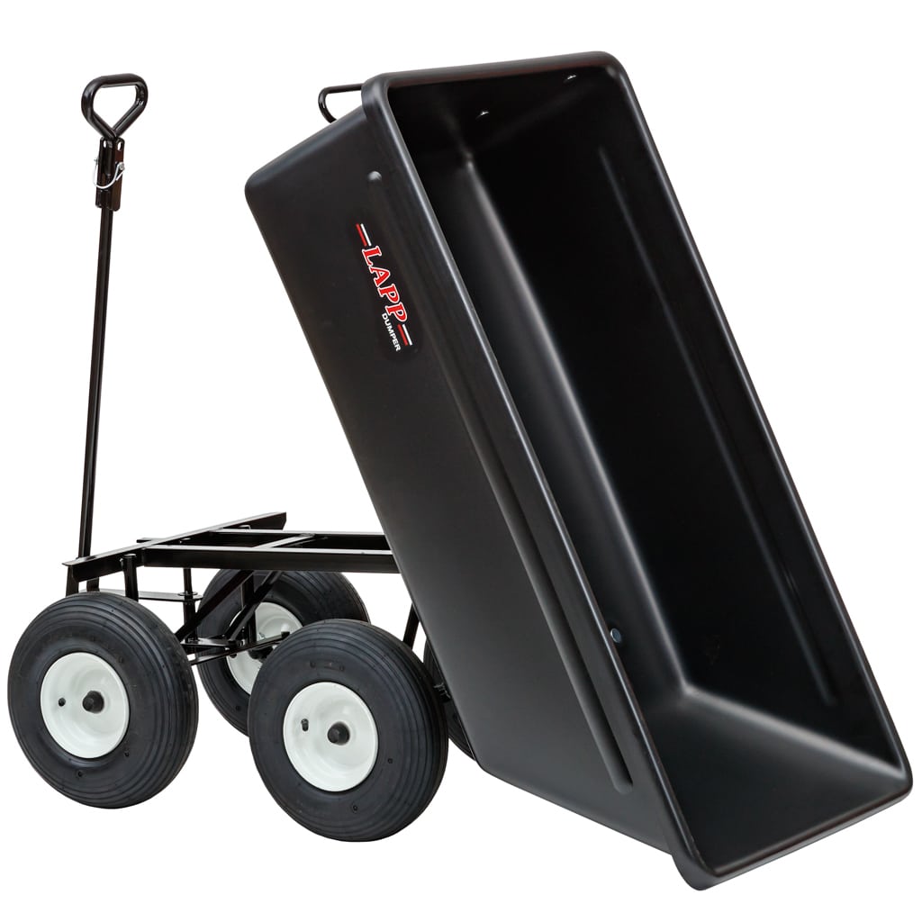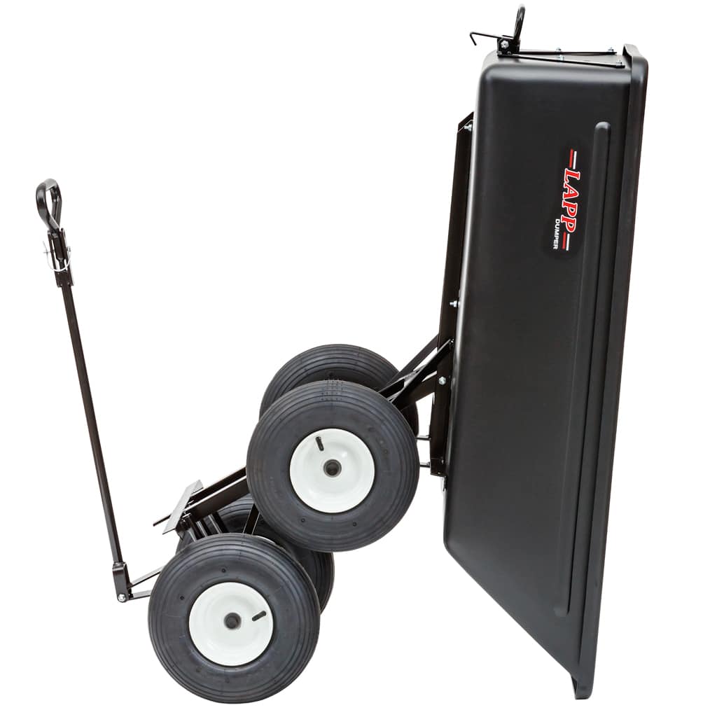 Every wagon underframe features a no tilt auto steering, air tire or flat free ball bearing wheels, and welded heavy gauge steel framework with bracing welded to the ⅝ inch axle. Lapp Dumper wagons can handle loads up to 1200 pounds which means your wagon can be used for lawn and garden projects or commercial uses.